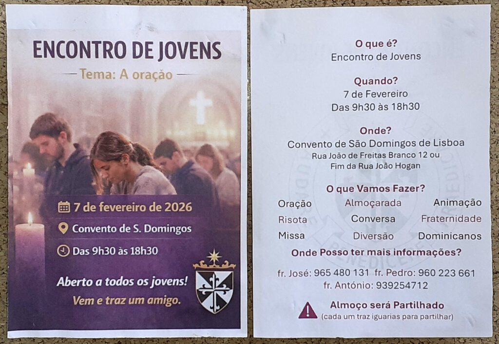 Os Dominicanos promovem no próximo 7 de fevereiro de 2026 um Encontro de Jovens, subordinado ao tema “A oração”, que terá lugar no Convento de São Domingos de Lisboa, entre as 9h30 e as 18h30.